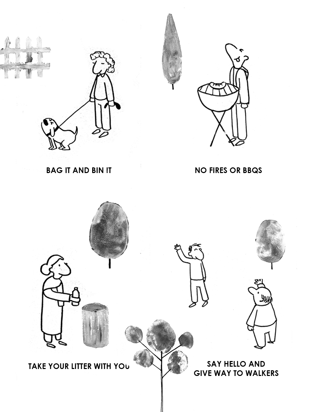 In communication with project manager Andrew Farrell, a memorable take on the UK countryside code came into fruition. A hybrid of digital line work and scanned paint textures to reflect the impurities of nature.